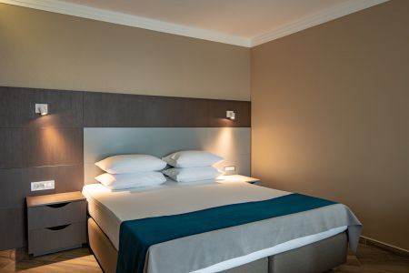 На территории отельного комплекса находятся три жилых корпуса на 37 номеров. Номера разных категорий комфорта — есть как стандартные комнаты, а так и апартаменты, оборудованные кухней. В комнатах приятный лаконичный интерьер, выдержанный в пастельных оттенках, везде есть кондиционер, плазменный телевизор, санузел.